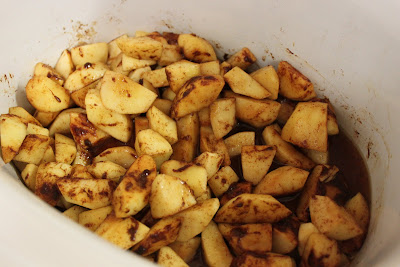 Cook on high for one hour, then cook on low for 8-10 hours (I was ok with 8 hours, but if your apples are bigger you might need 9 or 10). Stir every few hours. Here's what I had after 2 and a half hours: